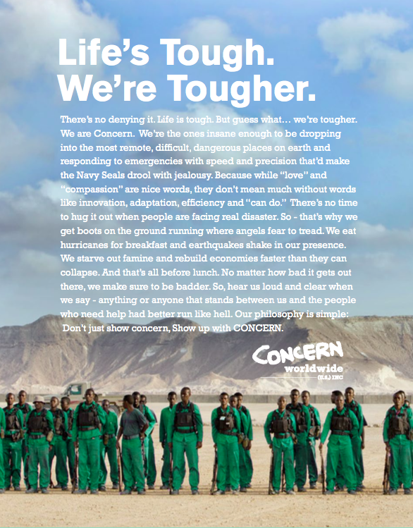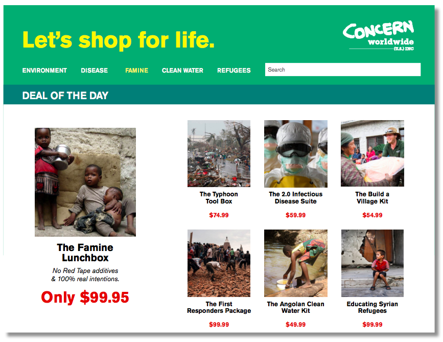 The Concern Corp is a charity that helps natural disasters around the world with the precision of a military operation. We captured their tough intensity and also built the idea of an actual Amazon marketplace of good goods for humanity. It’s called “We-commerce’